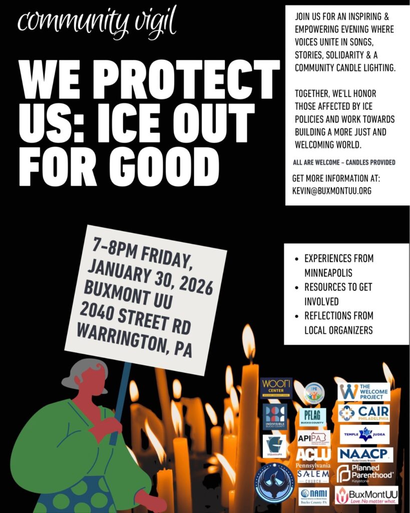 Hear experiences from clergy who answered the national call to Minneapolis, reflections from local organizers working to help our immigrant neighbors here in Bucks County, and find out ways to connect to this work after the vigil concludes.