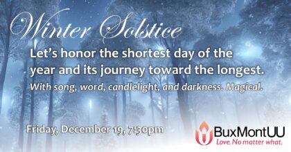 During this evening service we will honor the Winter Solstice, the longest night of the year with song, word, candlelight, and darkness. We will mark the turning of the Wheel of the Year, pause in the dark, and welcome back the returning light. This service is part Yule/Winter Solstice concert and part community ritual where the lights all around our building and in the sanctuary are extinguished and then we welcome back the light. Note for those will younger children – we do experience a couple of minutes of complete darkness in the sanctuary.